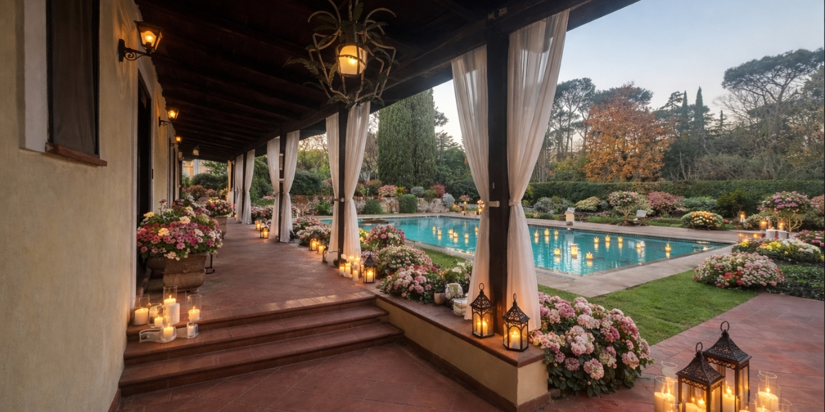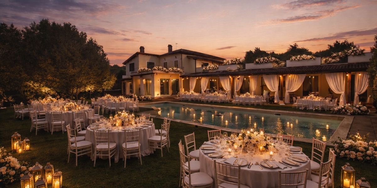 Il giardino ampio e curato, insieme al portico coperto, consente di allestire zone dedicate, corner buffet o aree relax. La piscina, elegante e armoniosa, diventa lo sfondo perfetto per feste private raffinate e coinvolgenti.